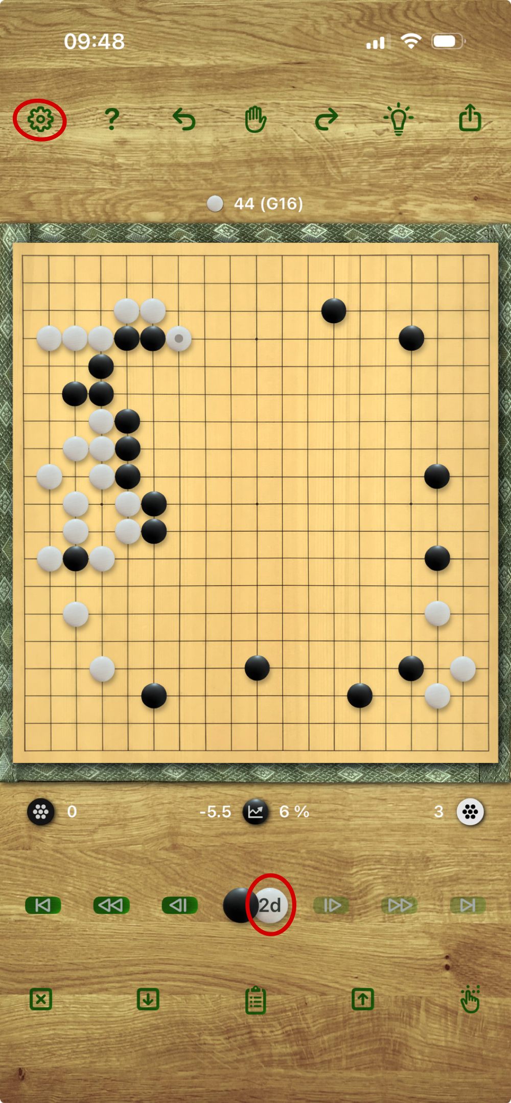 The status line below the board shows prisoners and current game situation from the perspective of the player who has the next move. If score and win rate information are displayed in white font, the information is up-to-date for the current position; a pale gray font indicates that the information is from a former position. A tap on the little chart symbol between score and win rate switches the score/win rate display on and off.