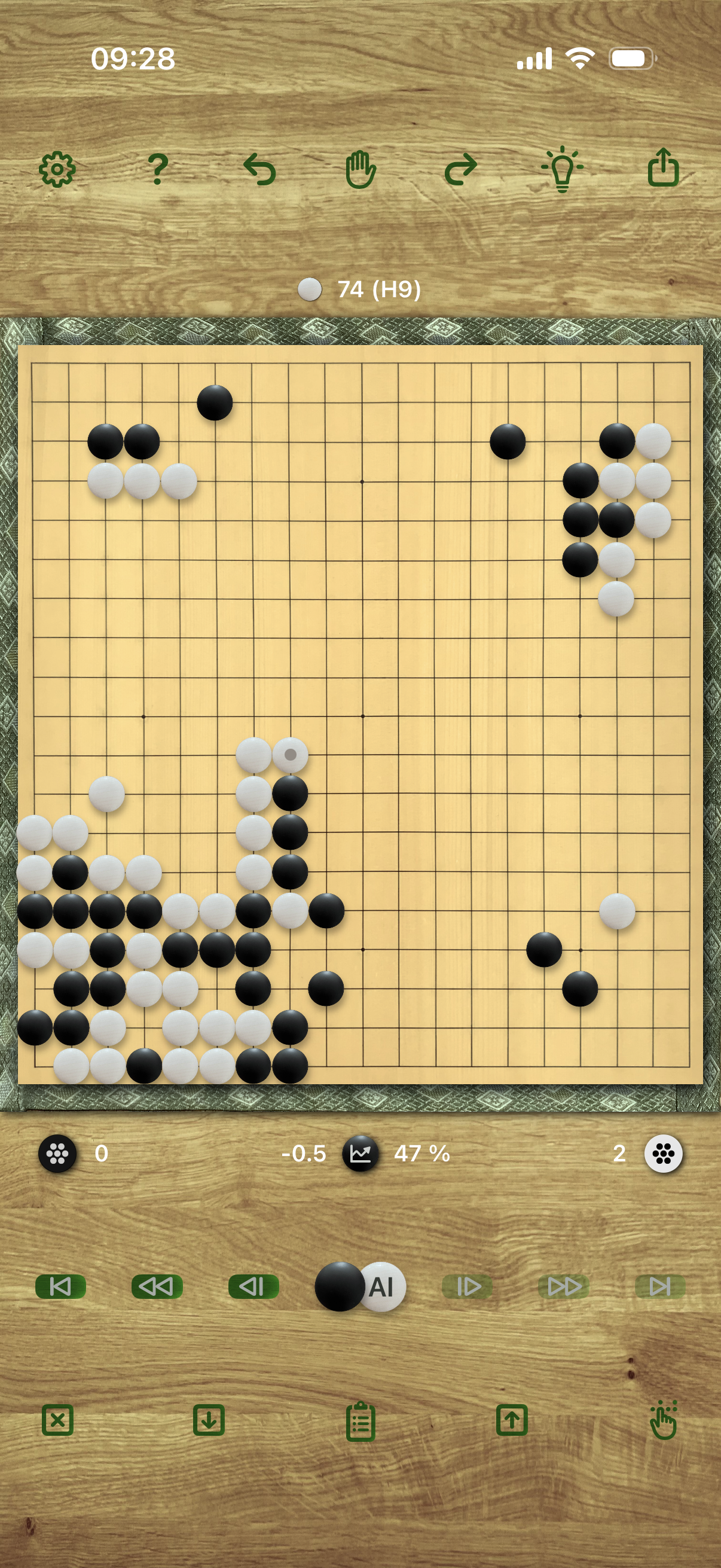 In the video, you will first see the beginning of an even game on the 9 x 9 board against the AI (at human imitation level 1-dan), starting on the settings sheet, and some features of the analysis mode.