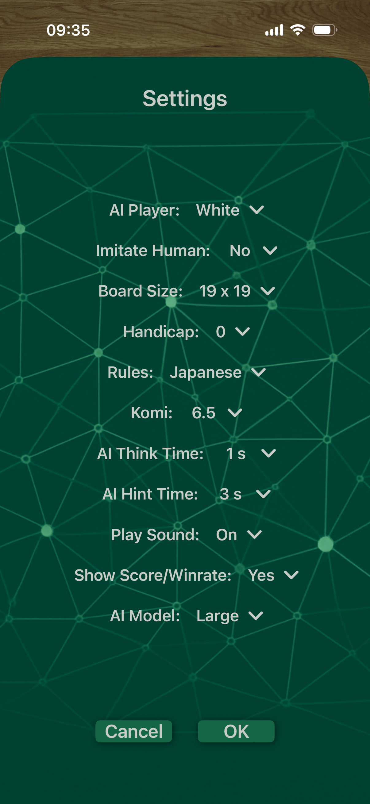 | • | Choose between human imitation levels (10-kyu to 9-dan, device dependent) or full KataGo superhuman strength, based on latest neural network models (2025/2026) |
