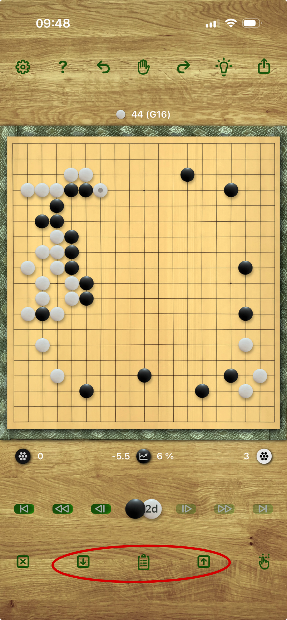 Use the share button to open a dialog for sharing the current game, the last stored position (if any) or the game currently saved in the clipboard. From the share sheet that opens, you can also copy the game or save it as an SGF file.